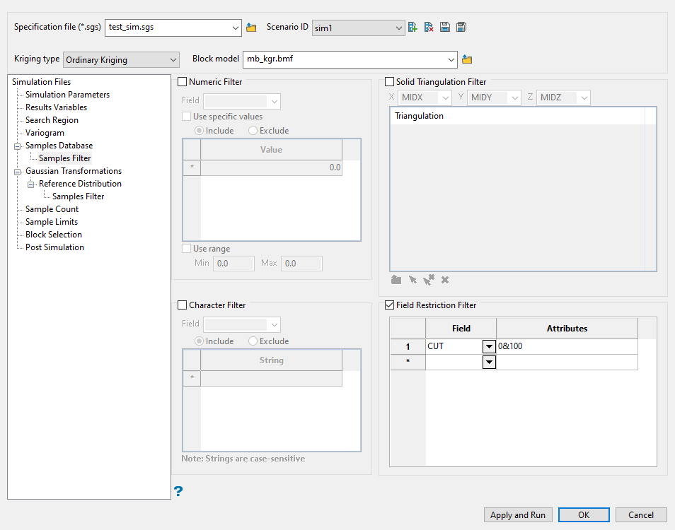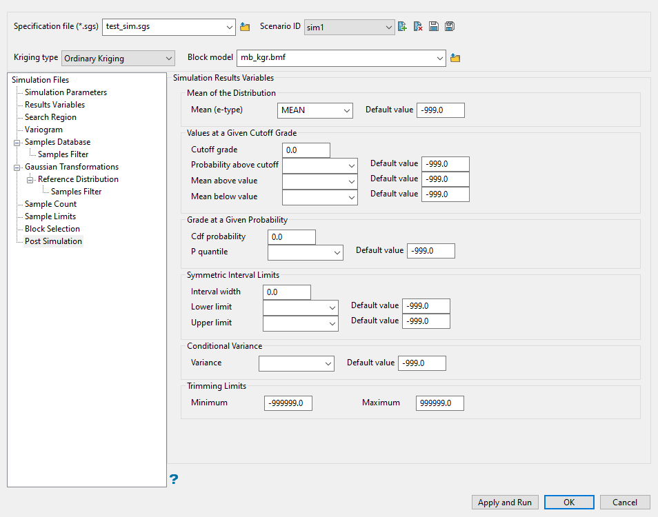 Define the minimum and maximum Trimming limits. These are the acceptable values for the simulation variable. Realisations that do not fall between this limit, will be discarded. If you are using Gaussian units, then negative values should be allowed. If you are using non-negative grades, then negative values should be discarded.