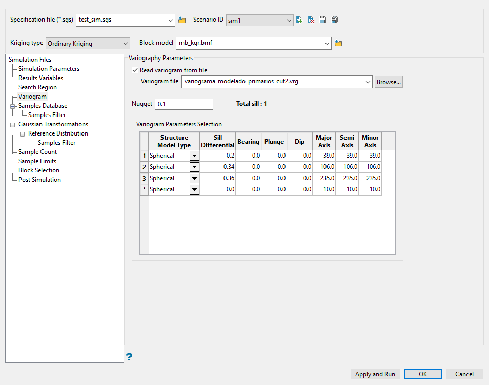 Use the Sequential Gaussian option to perform conditional or unconditional Gaussian simulation. Gaussian simulation will populate a grid of nodes in a block model that, if performed correctly, will honour the data distribution and the spatial correlation. Multiple realisations can be performed at a time. Each realisation will be stored in a separate block model variable.