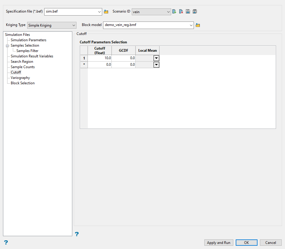 Note: Â A block model variable storing the local mean must exist to use simple kriging with local mean. You can select the variable using the drop-down list in the table on the Cutoff pane.
