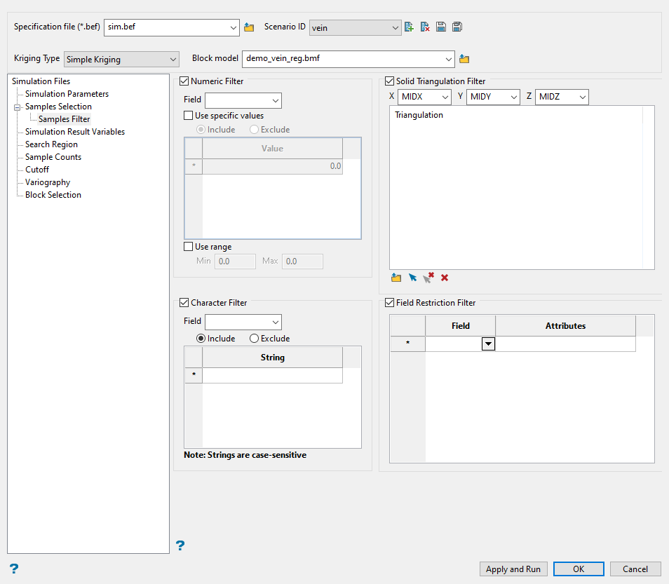 Use this pane to define the specification file, scenario ID, kriging method, and block model. You can also select which simulation options to use, and set the tail attributes.