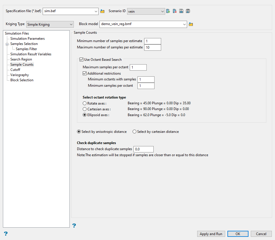 Example: Â The estimation program may find 30 samples near a block centre. If you had specified a maximum of 10 samples, then only the 10 samples closest to the block centre would be used. The distance to the block centre is calculated by an anisotropic distance based on the search radii. Up to 999 samples per estimate are allowed.