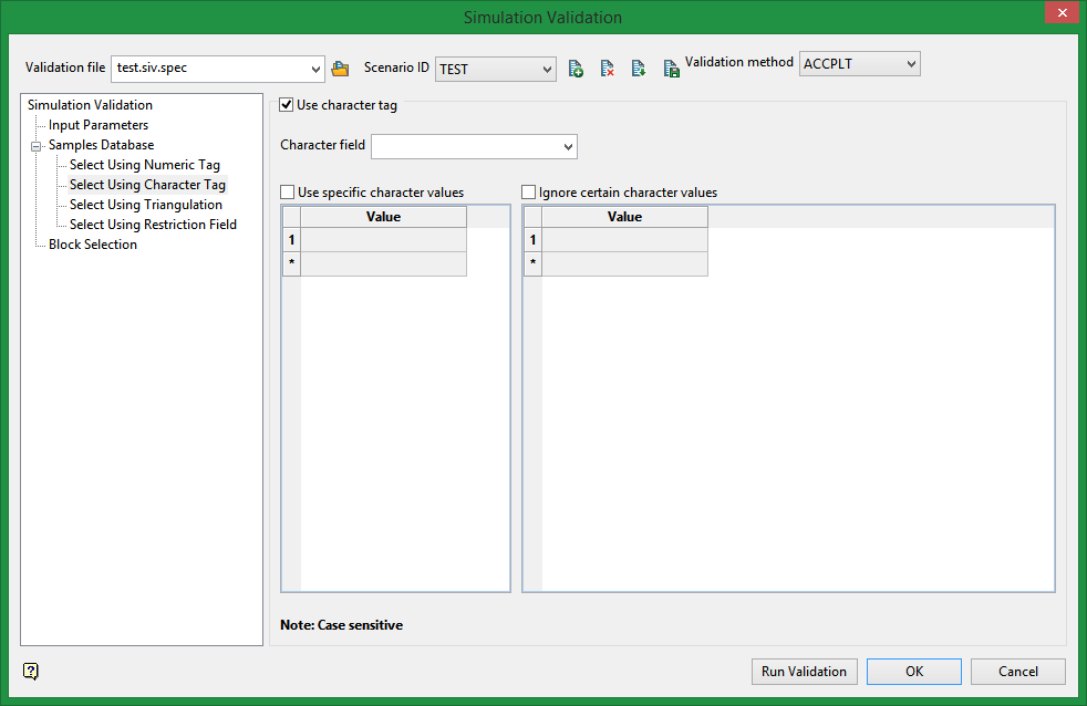 Enable the Ignore certain character values checkbox if you want to ignore specific character strings. The strings to exclude are specified through the Value column, which is displayed below the Ignore certain character values checkbox.