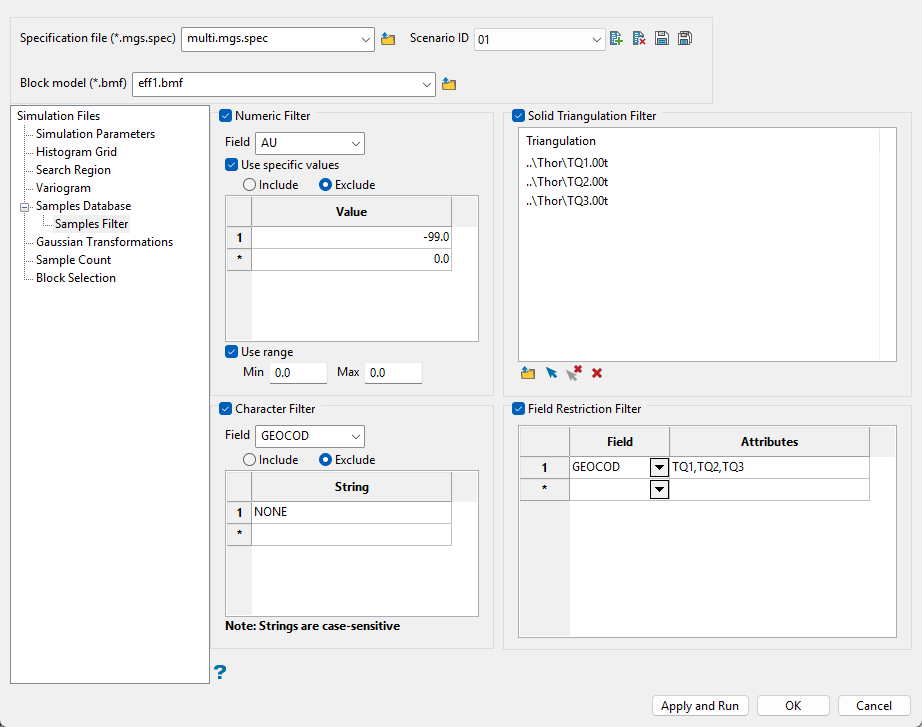 Use this panel to filter your sample data by setting restrictions on samples values, triangulations used, character values within database fields, and field attributes. You can use any combination of the four filters, or not use any at all. This panel is optional.