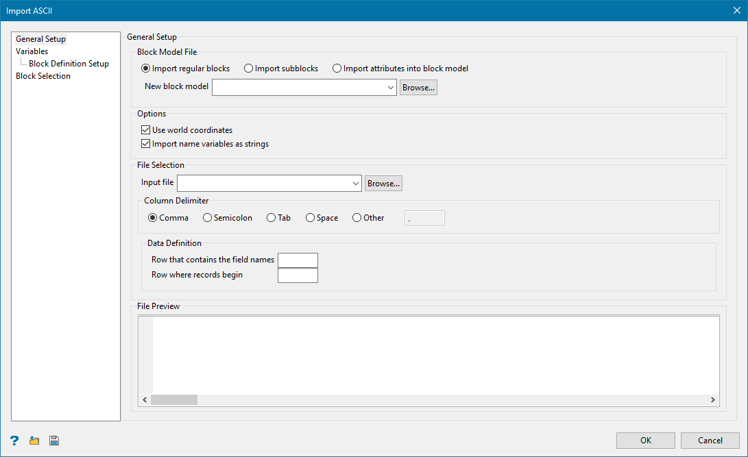 Use the Import ASCII option to create and update regular and non-regular block models. The Import ASCII tool contains functionality from the Block > Transfer > Import Regular and Block > Transfer > Import Sub-block options.