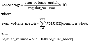 This method calculates the percentage of the regular block volume occupied by sub-blocks matching a specified ordinal value. The input variable type should be byte or integer, and the output variable type should be floating point. The number of sub-blocks intersected by a regular block and also matching the given ordinal value is denoted by NSB'. The calculation may be defined as follows: