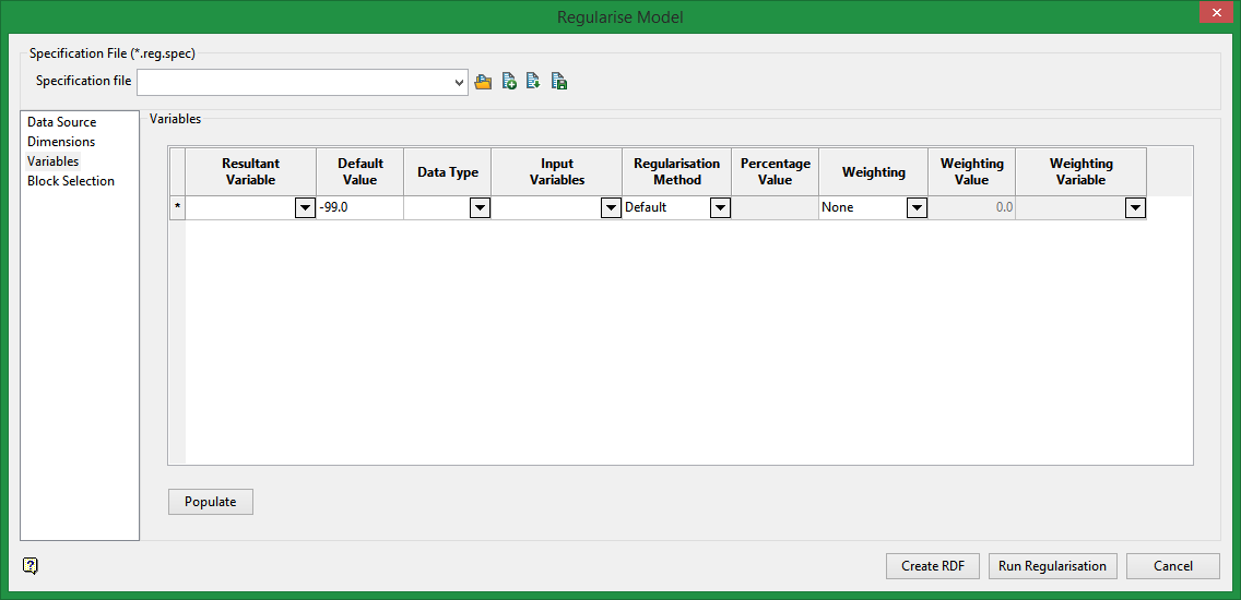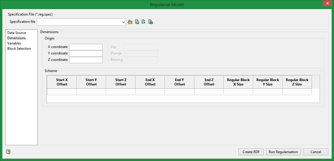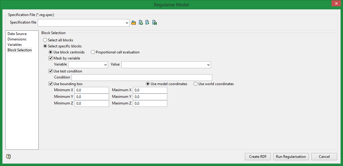 Use this option to create or edit a block model definition file (.bdf) that can then be used to regularise a block model.