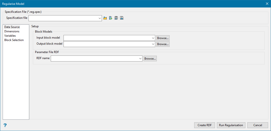 Important ! Â Use caution when selecting the file because the drop-down list will show all files with the <.BDF > extension. These will include normal block models in addition to regularised block models.