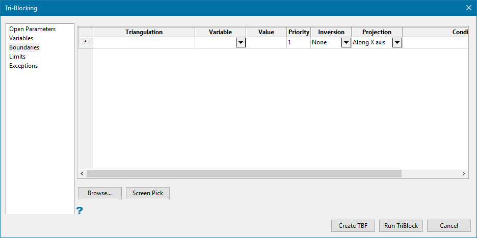 This section is used to choose the triangulations that will be used as boundaries when tri-blocking your block model, select the variables that will be assigned to the triangulation, and set the value that will be stored in the appropriate blocks with respect to the inversion and projection rules.