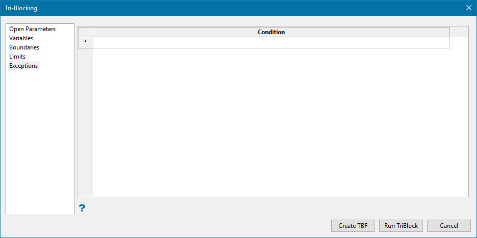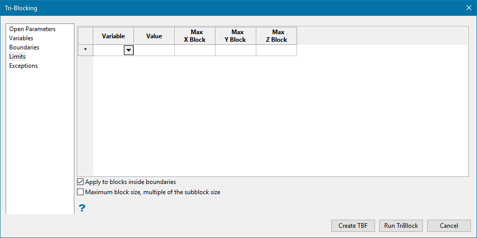 Tip: Â At any point after modifying panel inputs in the subsequent sections as desired, you can click the Create TBF button at the bottom of the panel to save the tri-blocking parameters file as a new or existing file, or click Run TriBlock to perform the tri-blocking on the block model.