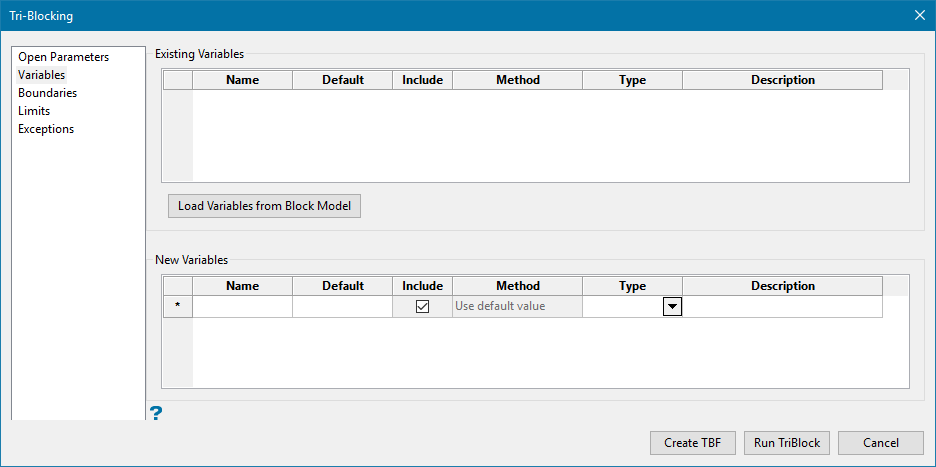 Click Load Variables from Block Model to populate the Existing Variables grid from a block model that has desired variables to choose from, if the grid is not already populated from a selected (