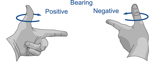 Enter the angles for bearing, plunge and dip. Vulcan uses the Left-hand Rule for orientation, as shown in the illustrations below. The bearing is an angle between 0° and 360°, measured along the Major axis, or index finger. Bearing changes with rotations around the Minor axis, or thumb. Positive and negative rotations are illustrated below.