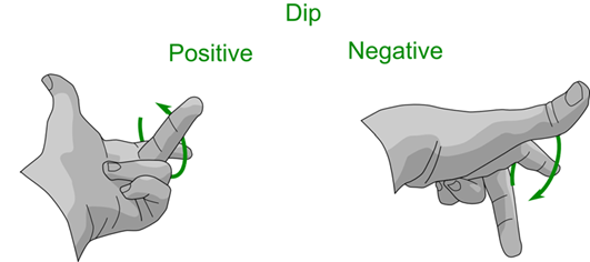The degree of dip is measured as a rotation from the Semi axis, or middle finger. Dip changes with rotations around the Major axis, or index finger. Positive and negative rotations are illustrated below.