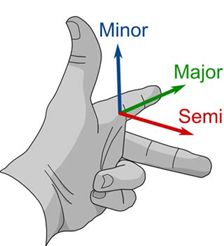 Enter the lengths of the Major, Semi-major and minor axes. Face north and extend your left hand. The thumb, index finger, and middle finger each correspond to an axis. In the configuration illustrated below, bearing is 0 or 360°, dip is 0°, and plunge is 0°.