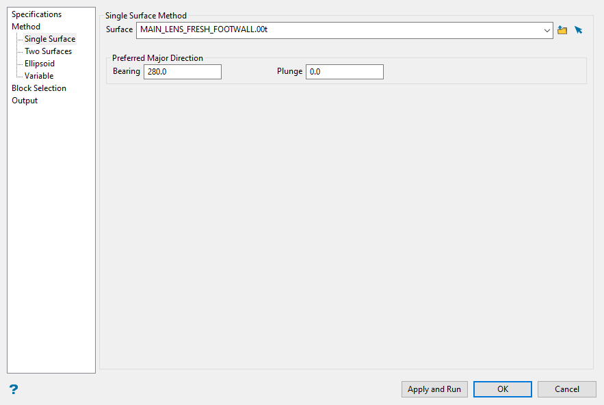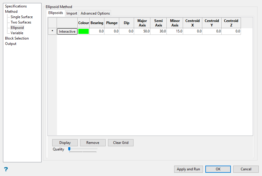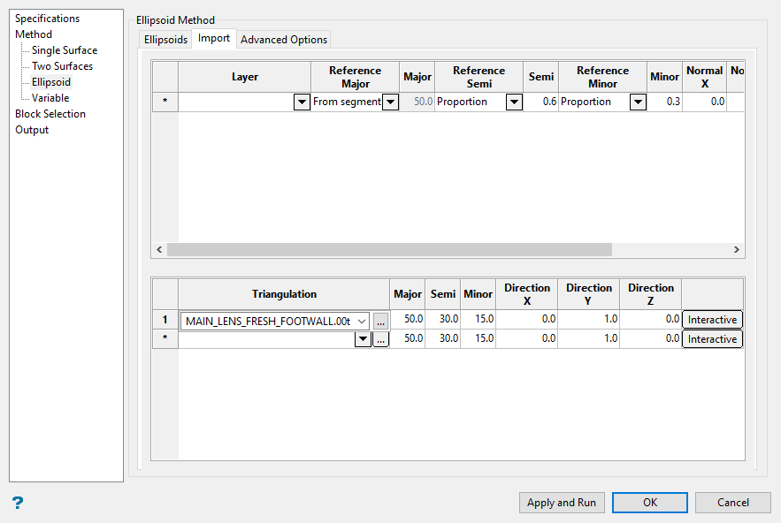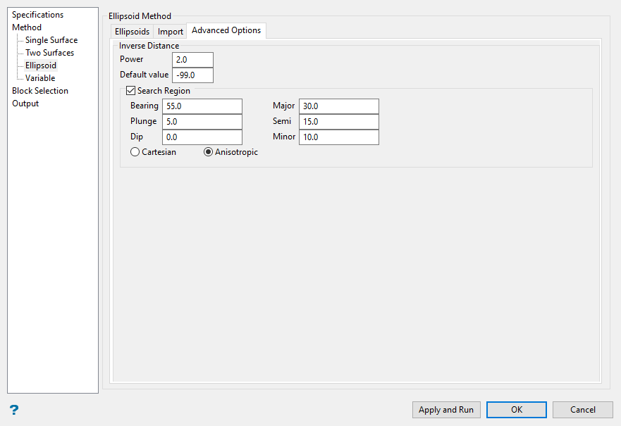 Enter the dimensions of the search box. The search box has sides with length twice the numbers given. The major axis radius is the search distance along the axis of the ore body. The semi-major radius is the search distance in the ore body plane perpendicular to the ore body axis. The minor axis radius is the search distance perpendicular to the ore body plane.