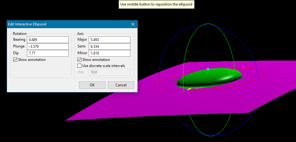 Click this button to interactively position the search ellipsoid on the screen and then dynamically shape it by clicking and dragging the axes. The bearing, plunge and dip, as well as the Major, Semi-major and minor axes will be automatically populated as you adjust the search ellipse on the screen.