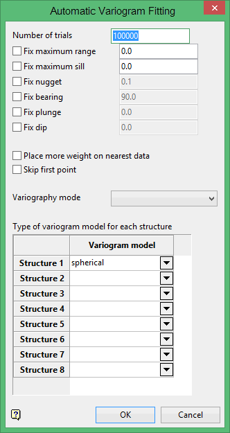 Although this option helps you in finding a good variogram function, it is not intended to be a final answer in fitting variograms. The auto fit procedure has no understanding of geology or of your particular deposit. It is only a tool to get you started in analysing your variography data. A geologist should always examine the results to see if the answers are good and applicable in your particular situation.