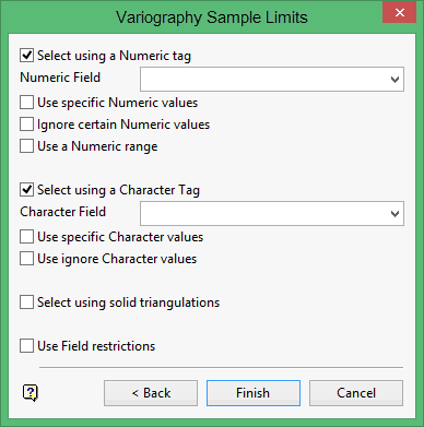 If down hole variography is not selected, then standard variography in three dimensions is performed. Enter the X, Y, and Z coordinate fields for the samples.
