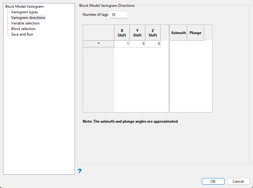 This section allows you to define the direction in which to calculate the experimental variograms, as well as the number of lags.