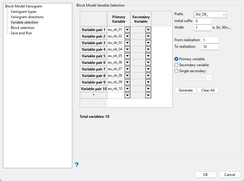 This section allows you to select the block model variables that will be used to calculate the variograms. The primary variable will be used to calculate the variograms, while the secondary variable is used to calculate cross variography.