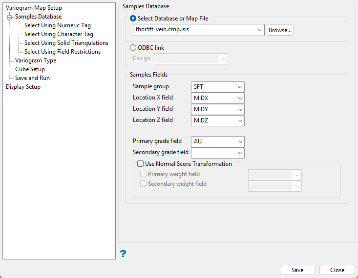 Use this section of the interface to select the database and database fields that will be used to generate the variograms.
