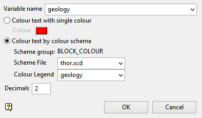 Select the variable information you wish to display from the drop-down list. Â Next, select the colour scheme you want to use to display the information. Â For static information such as block size, a single colour work well. Â However, for variables with dynamic ranges such as ore grades or rock types a colour scheme works well.