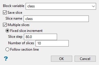 Note: Â If you are creating multiple slices, and have chosen to use an existing section line (the Follow section line option from the Block Model Slice panel), then you will be prompted to select the section line instead.
