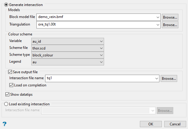 Use this option to intersect a block model with a triangulation and draw the result as an underlay on the screen. The intersections are coloured from a scheme file and one block variable.