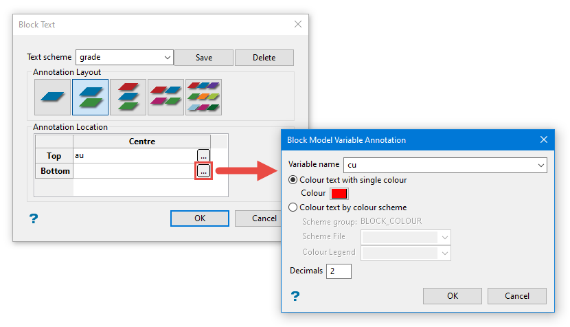 The text annotations are defined through the Block Text panel, which displays after the Block Model Slice panel is completed.