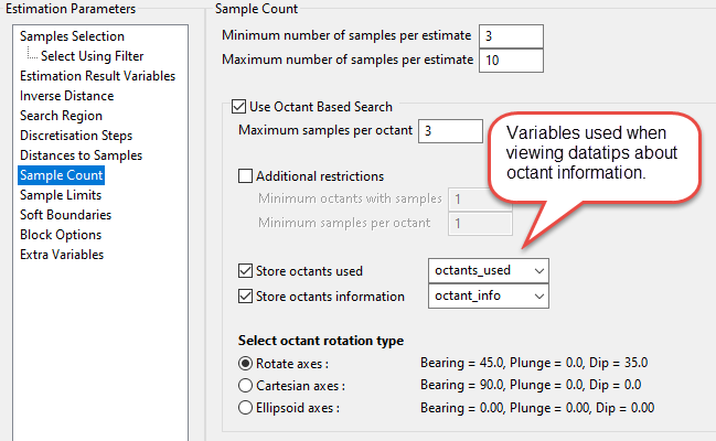 Vulcan stores information regarding whether or not samples from a particular octant were used during estimation. The octants are labelled 1 through 8. If samples from an octant are used during estimation, then the octant is flagged with a 1. If samples from an octant are not used, the octant is flagged with a 0. The variables used to record the number of octants used to estimate a block and record the flag information are stored in variables selected while setting up the estimation parameters.