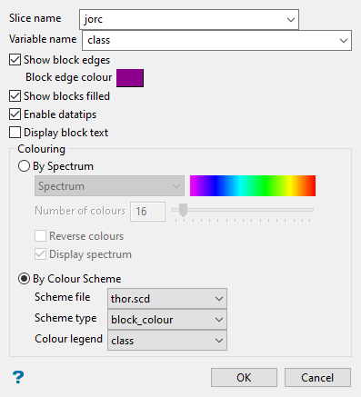 Select the By Colour Scheme option to colour the slice by using a Vulcan colour scheme. A default scheme file and type is entered automatically, these can be altered. Select the file, type, and colour legend from the drop-down lists.