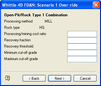 Only applicable if the Enter time/replacement costs option has been selected on the previous panel. The first field refers to the processing method defined for an open-pit/rock type combination, the second field refers to an underground/rock type combination.