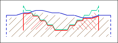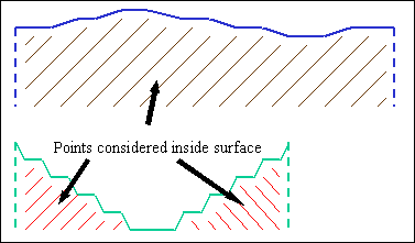 The following diagrams use section views of a topography triangulation and a pit triangulation. For a surface, an imaginary vertical line is drawn from the outer edges of the triangulation.