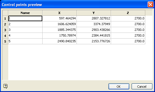 Check the Preview/edit selection check box to preview and, if desired, modify the control point details before saving the information in the layer. The control point details will be displayed through the Control points preview panel. The Control points preview panel will allow you to edit point names as well as coordinate information.