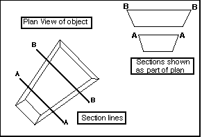 You will then be prompted to select a section line. This can be any line currently visible on the screen. Diagram 2 illustrates how a section view can be added to supplement the current plan view. This option was used twice to create the two sections views in diagram 2.