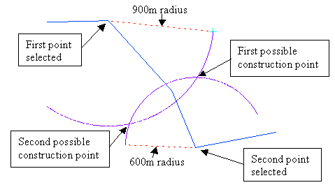 When there is only one point of intersection, (which means the distance from both points is exactly half the distance between the points) the construction point displays and you are prompted to indicate another pair of points. Cancel when you have finished creating points.