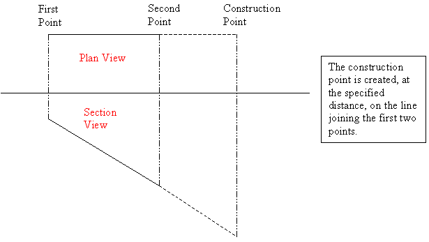 Enter the distance, in real world units, from the second point. A positive number will create a point further out as shown in the diagram. A negative number will create a construction point short of the second point. Real world units are defined in the project specification file (.dg1).