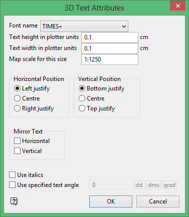 Enter the width, in plotter units, for the text. Unlike 2D text, 3D text can be stretched horizontally and vertically by varying the ratio of the height to the width.