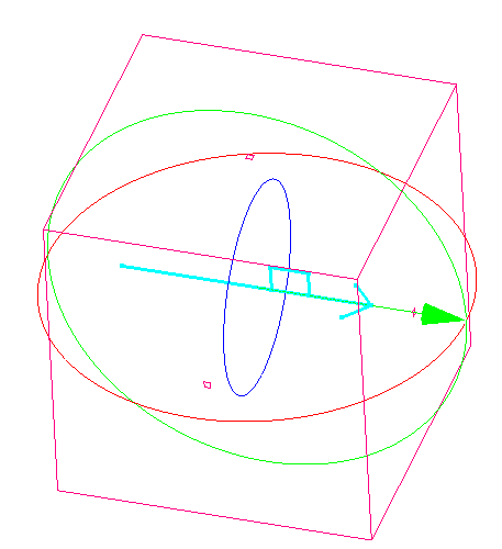 When the objects are selected, three circles, centred on the middle of the objects extents, and a cube are displayed. The red circle represents the bearing, blue the plunge and green the dip. The cube represents scaling. The green arrow represents dip direction (see Diagram 3). The Transform Object panel is also displayed.