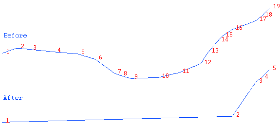 In the above diagram, points 1 and 16 were selected as the two points between which to create the line of best fit. All of the points between the selected points are removed.