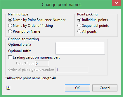 Select this option to name each point, in selected order, with a user defined sequence. Note the first point picked will be named with the starting number defined in the Order of picking start number field. Subsequent point names are incremented by one.