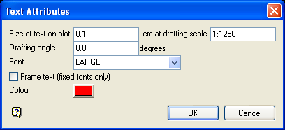 The following panel is then displayed. You can alter the size of the text on a plot, the drafting scale and angle, font and colour of the text objects.