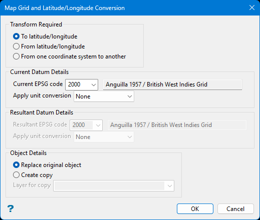 Option Description To latitude/longitude Convert map grid coordinates to geographic coordinates. Enter the current grid and zone.