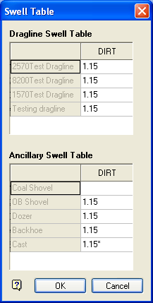 The Set Swell Table option allows you set, or edit, the swell table - a table that details the maximum swell factors to be applied, when moving a certain type of material with a certain piece of equipment. Maximum swell factors for each piece of dragline and ancillary equipment can be set or edited.