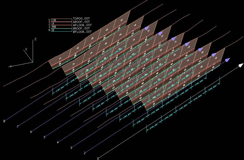 Insitu blocks are created on each section by intersecting each strip's highwall profile with each section's horizon surfaces. On each section, the number of insitu blocks created will be equal to the number of strips times the number of horizons. Insitu blocks of negligible area are automatically classed as Null blocks and are made invisible.