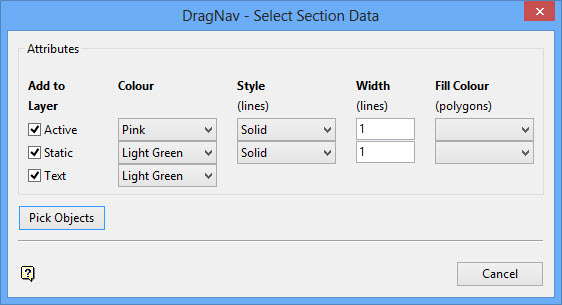 The 'DragNav - Select Section Data' panel is redisplayed for each object selected.