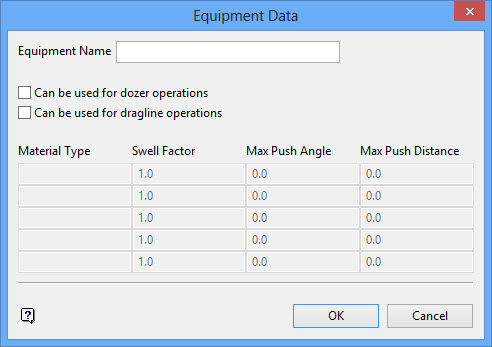 Enter the material type. This value refers to the type of material that the swell factor will be applied to when using this piece of equipment. Only those material types specified in the horizon table (see the Horizons > Create option) will be relevant.