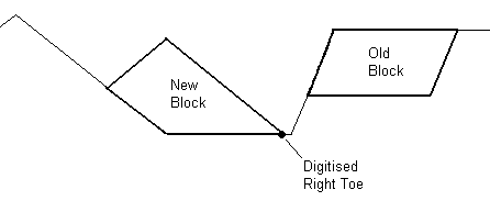 Use the Dragline - Right Toe option to move a block by dumping it in a triangular spoil pile, with its right toe positioned where you digitise. The slope of the spoil pile is determined by the block's angle of repose, set with the Blocks > Edit Repose option. This option is most useful for simulating spoil piles created by draglines.