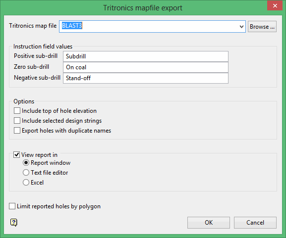 Use the Tritronics Export option to export blast information to a nominated Tritronics mapfile (.map). The resulting file can be used with Tritronics equipped holes.