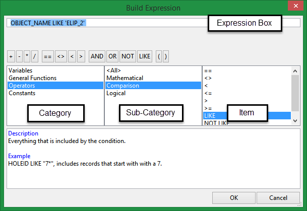 Build an SQL expression one term at a time by selecting a category from the first column, a sub-category from the middle column, then double-clicking an item from the third column. This will become the term in the expression.