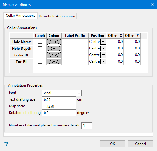 The Downhole Annotations tab is used to set up labels that will be displayed at the bottom of the drillhole. It determines which labels will be visible and where they will be located.